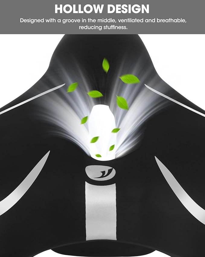 - 【Breathable Hollow Design】This bicycle saddle was designed with a groove in the middle, which can speed up the airflow, ventilated and breathable to reduce muggy feelings.