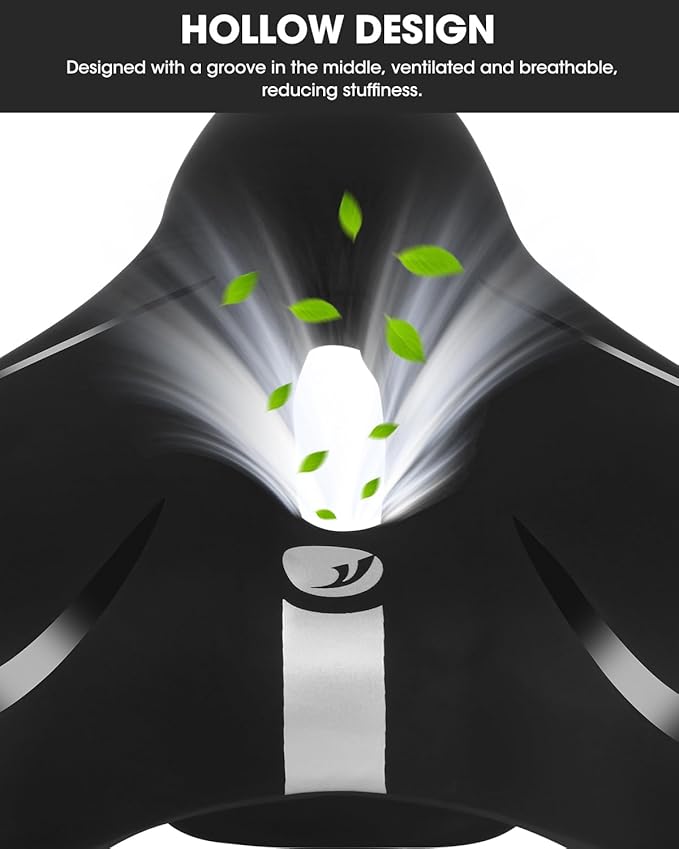 - 【Breathable Hollow Design】This bicycle saddle was designed with a groove in the middle, which can speed up the airflow, ventilated and breathable to reduce muggy feelings.
