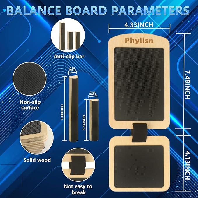- Product specifications: Our balance board dimensions: 11.23 inches long x 4.33 inches wide x 1.37 inches high. Weighs only 300 grams. It consists of two removable plates and three nylon balance rods, connected with Velcro. No matter your weight or foot width, you can use our training equipment.