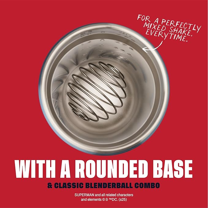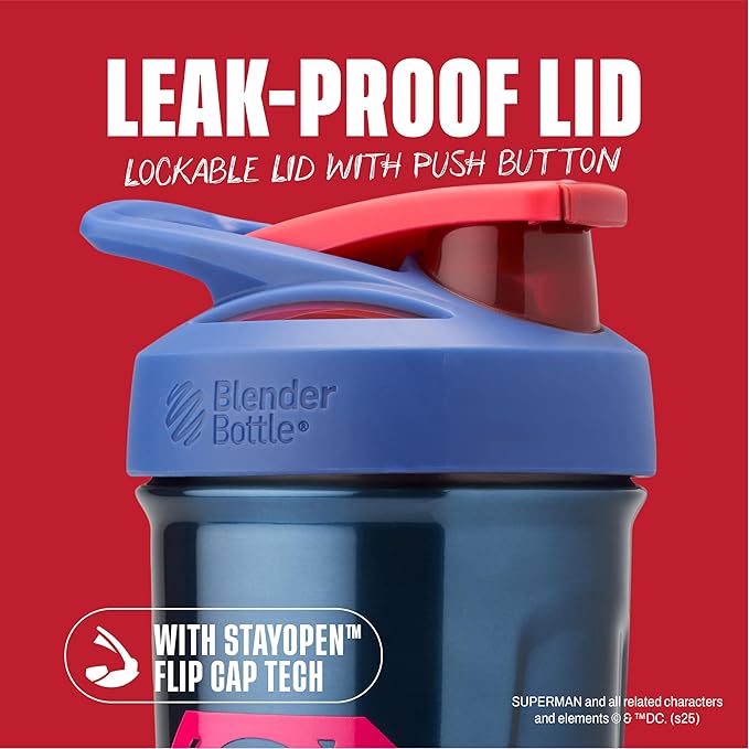 - Stainless steel, spill-proof BlenderBottle with officially licensed Justice League icons, for mixing supplements and smoothies, features an easy-open/easy-close push-button flip cap with a sliding lock to prevent accidental opening