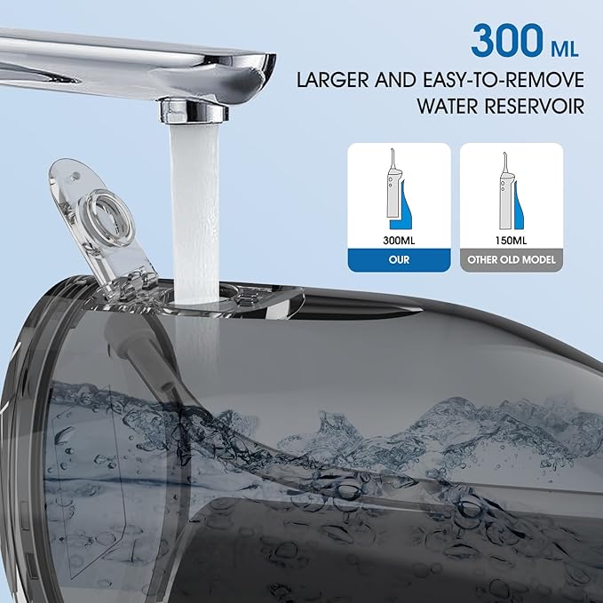 - 300ml Water Tank, 5 Flossing Nozzles: The 300ml removable water tank is easy to clean and does not need frequent refills. This water flosser cordless provides 5 interchangeable nozzles to suit different teeth conditions, fulfilling your variety needs of brace and bridge personal toothbrushes denture bath care.