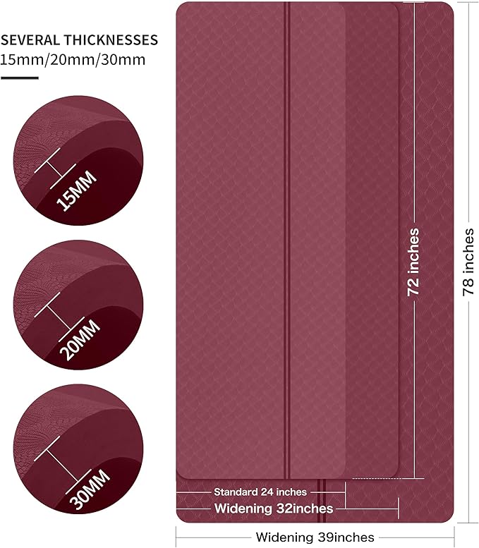 - 🌹EXTRA LONG EXTRA WIDE: nuveti's 72"x32"/78"x36" offers adequate space to fit any type of exercise like yoga, pilates, bikram, and fitness exercise.Most yoga mats on the market are 6mm, 8mm or even thinner. This yoga mat is thickened to 15mm,20mm,30mm which can provide more support and protection for your ankle, knees, joints, and body on hard floors, as well as absorbs vibration and reduces noise.