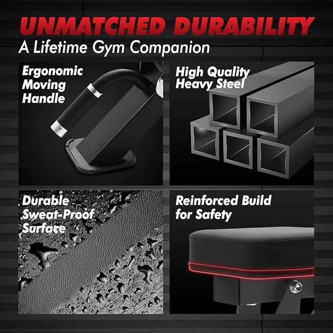 - High Weight Limit: Our robust weight bench, tested for up to 1300lbs, supports varied fitness routines with a stable triangular base and enlarged anti-slip feet, ensuring safety and security during intense or extended exercises.
