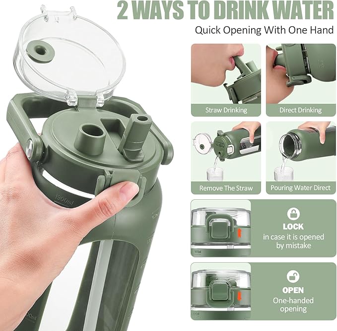 - 2 WAYS TO DRINK: BLUEGO 64oz sports water bottle features POP-UP lid with ONE-CLICK SAFETY LOCK and a covered DUSTPROOF CAP to keep hygienic and better leakproof effect. The 2-IN-1 STRAW LID enables the water bottle two way to drink: spillproof sip by a built-in flip straw or direct drink through chug mouth, both are convenient and ergonomic.