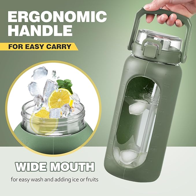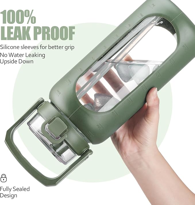 BLUEGO 64oz Glass Water Bottle with Handle and Straw, Motivational Sports Water Bottle with Time Marker and Silicone Sleeve Leakproof Drinking Bottle for Travel Gym Workout, Olive