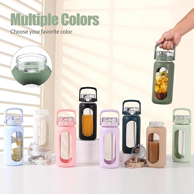 - LARGE CAPACITY WITH TIME MARKER: BLUEGO glass bottle has 64oz capacity with rubber sleeve TIME MARKER and water capacity markers. The clear and see-through window help you to track the amount of water you drink, always keeping you hydrated. Meanwhile the water bottle lid with a sealing cap that effectively prevents any leakage.