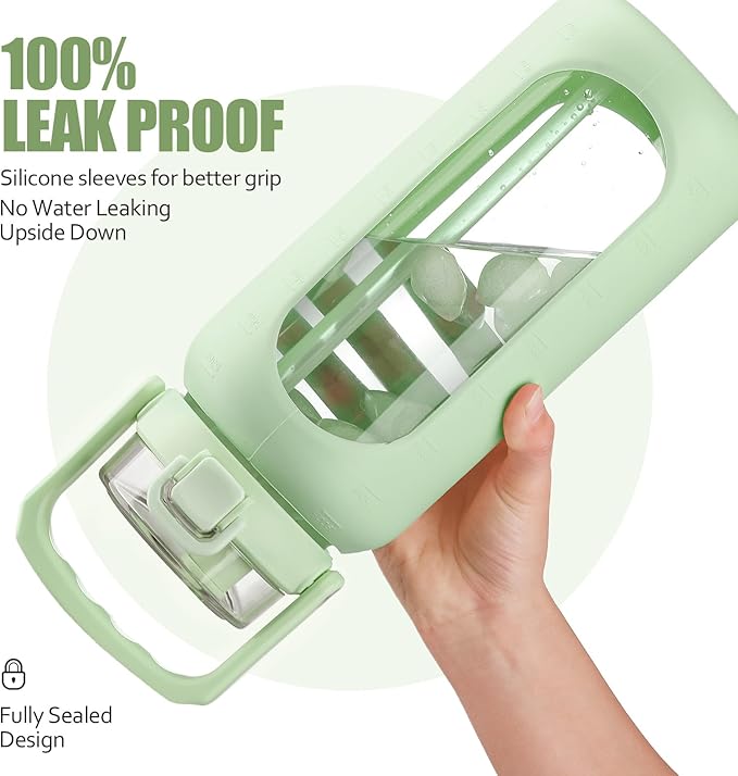 BLUEGO 64oz Glass Water Bottle with Handle and Straw, Motivational Sports Water Bottle with Time Marker and Silicone Sleeve Leakproof Drinking Bottle for Travel Gym Workout, Light Green