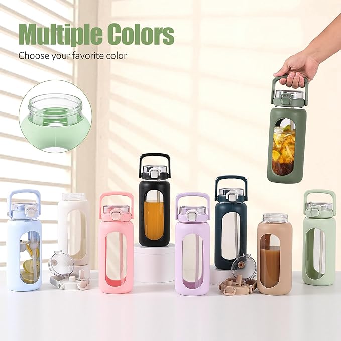- LARGE CAPACITY WITH TIME MARKER: BLUEGO glass bottle has 64oz capacity with rubber sleeve TIME MARKER and water capacity markers. The clear and see-through window help you to track the amount of water you drink, always keeping you hydrated. Meanwhile the water bottle lid with a sealing cap that effectively prevents any leakage.