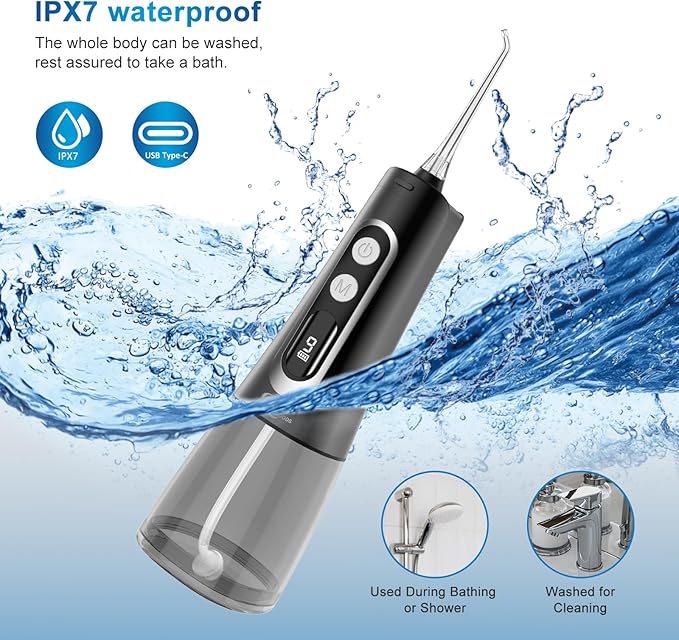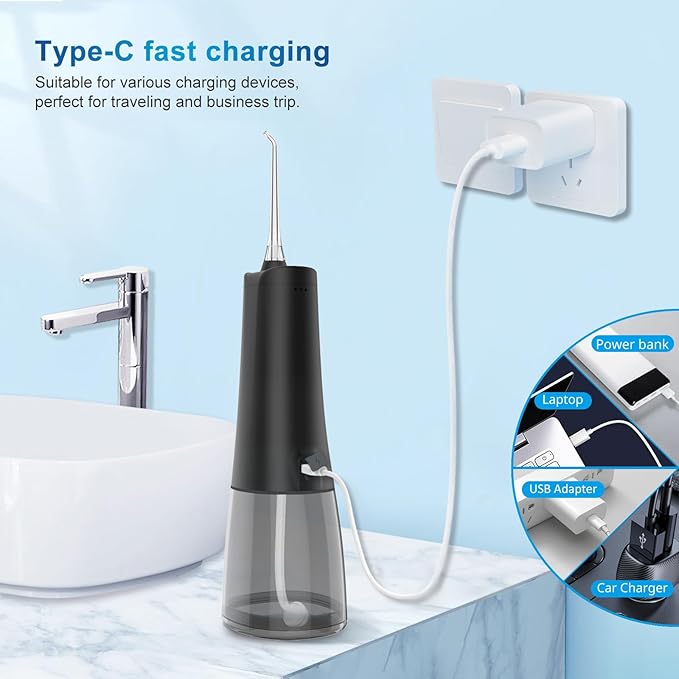 - 1. Powerful Battery &T IPX7 Waterproof : JNGOODS Water flosser With 2000mah powerful battery, fully charged need 4 hours and used continuously for about 25 days. Come with Type-C cable,(Adapter Not Included), applicable to a variety of charging equipements such as power bank, computer, laptop... With double-sealing rings, oral irrigator prevent water leakage reliably, can use for shower in the bathroom and it's washable to clean