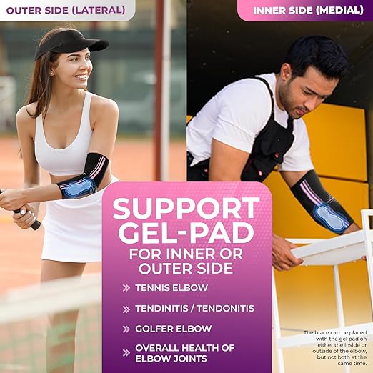 - OUR UNIQUE SYSTEM: Our brace features a strategically placed gel pad to target pressure points for both tennis and golfer's elbow, depending on its placement. It also includes a removable and adjustable compression strap that wraps around your elbow, providing compression when needed most. Suitable for both men and women.