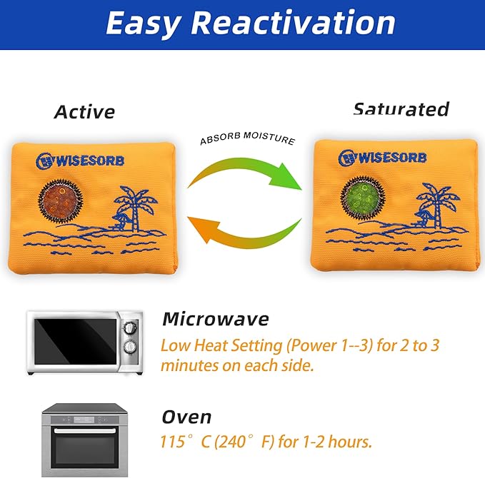- 【Easy Reactivation in Microwave and Oven】: Reactivating the moisture absorbers is quick and simple. In the microwave, you can remove collected moisture by microwaving for up to 2 minutes on each side. Note: Use Microwave power levels 1-3 for low heat to avoid melting the transparent window. Alternatively, for oven reactivation, place the reusable silica gel desiccant dehumidifier in the oven for 1 to 2 hours at 200°F to 250°F (avoid exceeding 250°F). The actual reactivation time may vary depending on the condition of the silica gel beads.