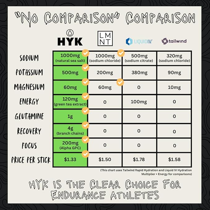 - Superior Hydration with More Electrolytes - HYK is packed with 1,000mg of Sodium, plus Potassium and Magnesium, delivering a robust electrolyte profile that outperforms most hydration products on the market. Our optimal blend rapidly restores fluid balance, helps prevent muscle cramps, and keeps you performing longer in demanding conditions.