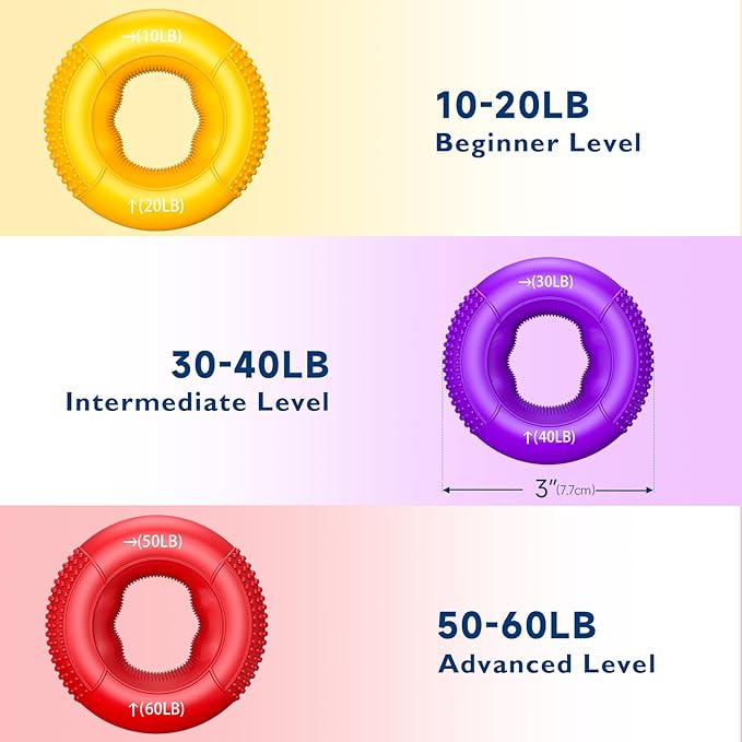 - ๐๐ผ๐ป๐ด-๐น๐ฎ๐๐๐ถ๐ป๐ด & ๐๐น๐ฒ๐ ๐ถ๐ฏ๐น๐ฒ ๐๐ฟ๐ถ๐ฝ ๐ฅ๐ถ๐ป๐ด๐: Advance your hand strength with our progressive hand gripper rings, offering adjustable resistance from a gentle 10-20LB to a tough 50-60LB. Each ring is made from premium food-grade silicone, ensuring lasting elasticity and shape retention. The non-slip textured surface provides a secure and comfortable grip.
