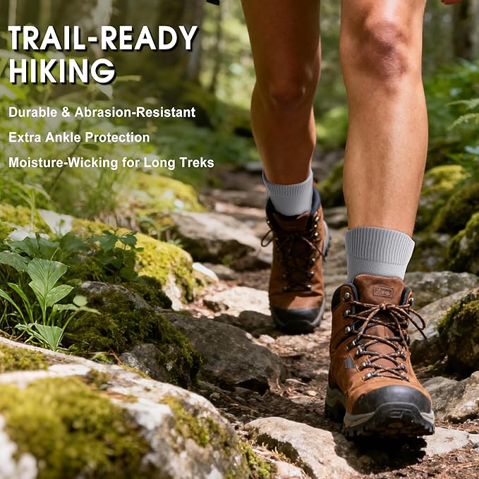 • Trail-Ready Durability : Built to conquer rugged terrain, these socks are ideal for hiking adventures, mountain trails, and extended camping trips. Crafted with durable, abrasion-resistant materials, they feature an enhanced heel tab to minimize wear and tear and mesh pores for optimal breathability. Designed for outdoor explorers and nature enthusiasts who demand both comfort and protection.
