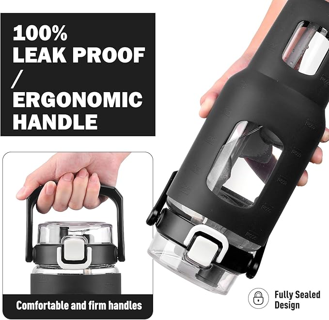 - 100% LEAKPROOF- 40oz glass water bottle with airtight sealing lid and one-click safety lock to prevent any leak or spills by accident, 100% leakproof.With silicone sleeve for non-slip and against slight bump. Made of thickened glass, our water bottle can go right in your dishwasher