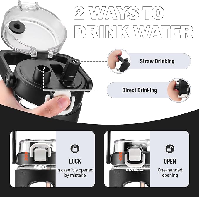 - GLASS WATER BOTTLE WITH HANDLE- Glass water bottle with portable top handle and dustproof cap for hygienic purpose. The water tumbler offers 2 ways to drink: flip straw drink and chug mouth for gulp, both are perfect for sipping on the go. With silicone sleeve for added protection and secure non-slip grip