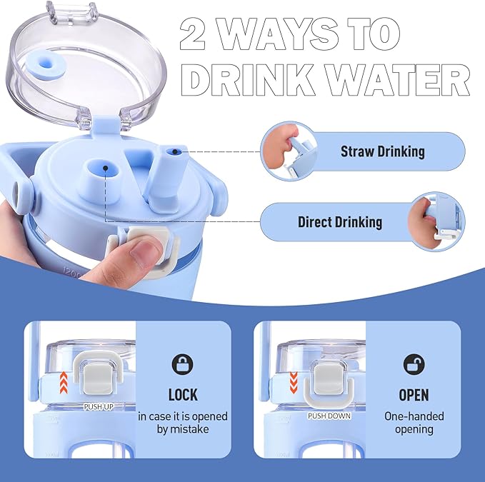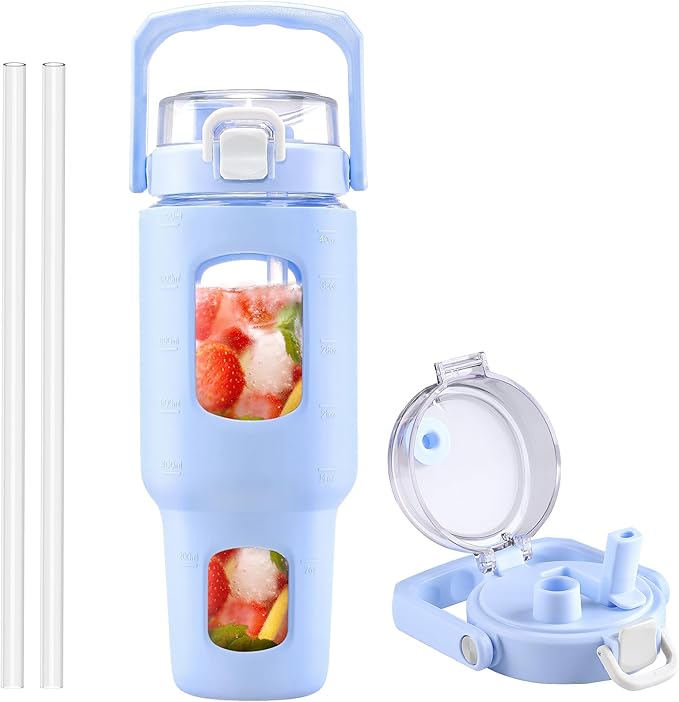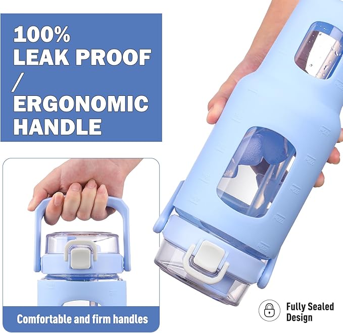- GLASS WATER BOTTLE WITH HANDLE- Glass water bottle with portable top handle and dustproof cap for hygienic purpose. The water tumbler offers 2 ways to drink: flip straw drink and chug mouth for gulp, both are perfect for sipping on the go. With silicone sleeve for added protection and secure non-slip grip