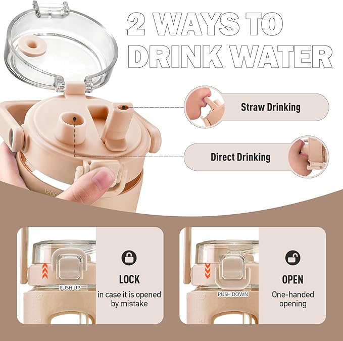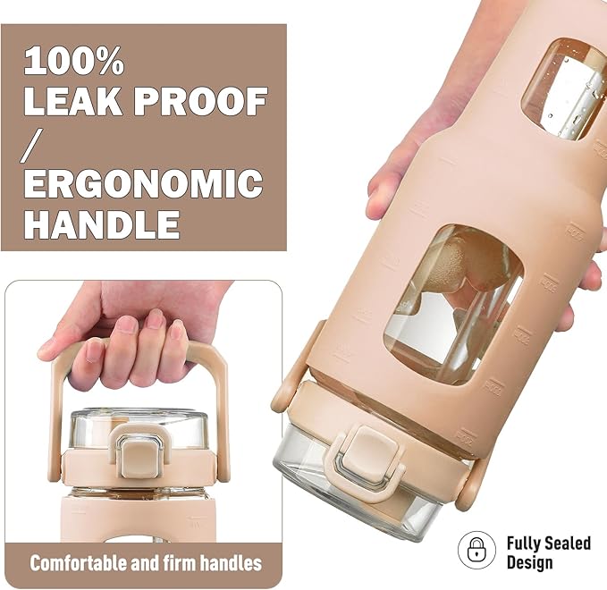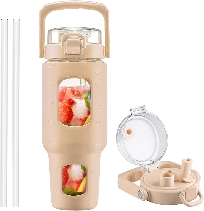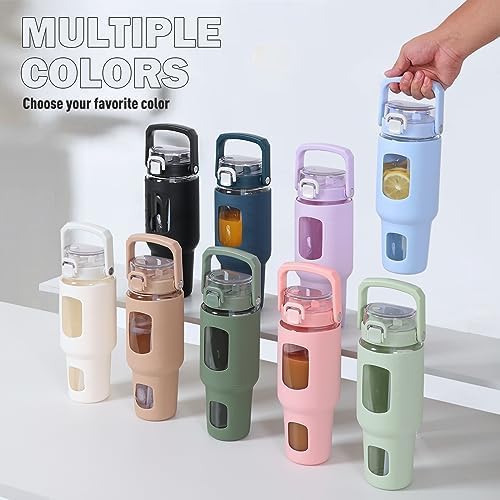 - GLASS WATER BOTTLE WITH HANDLE- Glass water bottle with portable top handle and dustproof cap for hygienic purpose. The water tumbler offers 2 ways to drink: flip straw drink and chug mouth for gulp, both are perfect for sipping on the go. With silicone sleeve for added protection and secure non-slip grip