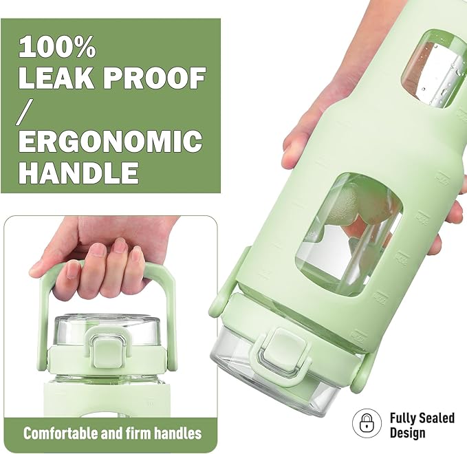 - 100% LEAKPROOF- 40oz glass water bottle with airtight sealing lid and one-click safety lock to prevent any leak or spills by accident, 100% leakproof.With silicone sleeve for non-slip and against slight bump. Made of thickened glass, our water bottle can go right in your dishwasher