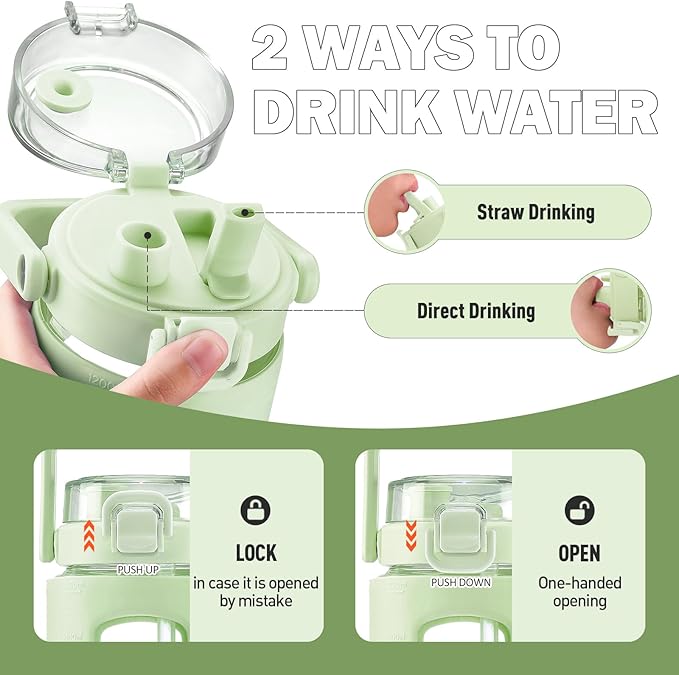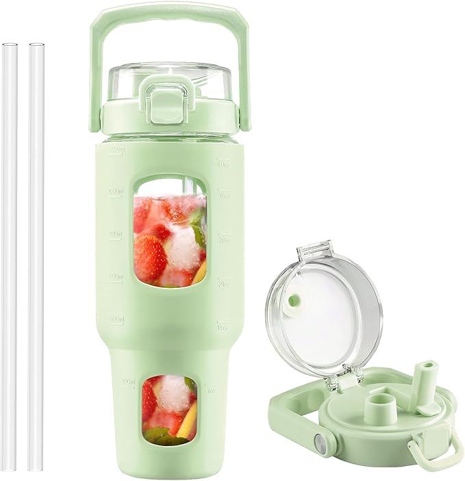 - GLASS WATER BOTTLE WITH HANDLE- Glass water bottle with portable top handle and dustproof cap for hygienic purpose. The water tumbler offers 2 ways to drink: flip straw drink and chug mouth for gulp, both are perfect for sipping on the go. With silicone sleeve for added protection and secure non-slip grip