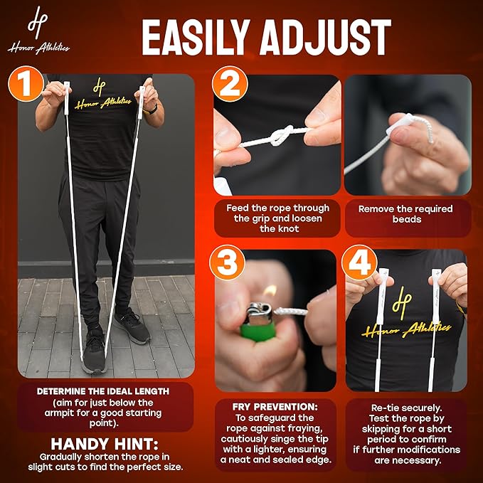 - β Easy to Adjust & Size π Easily adjust the length of the jump rope to your preference. Designed at 10', it is perfect for individuals as tall as 6'4". For a custom fit, undo the washer/tie from one end of the handle, adjust the beads accordingly, and snip the excess cord. Dive into your workout right away