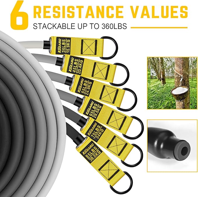 - đȘă360 lbs Heavy Duty Resistance Band Setă 6 different resistance levels (35 lbs, 45 lbs, 55 lbs, 65 lbs, 75 lbs, 85 lbs), can be used individually or stacked in any combination, you can adjust the resistance from 35 lbs to Maximum 360 lbs. Whether you are a fitness enthusiast or a beginner, this set of high-quality resistance bands can meet your exercise needs and give you a lot of room for improvement.