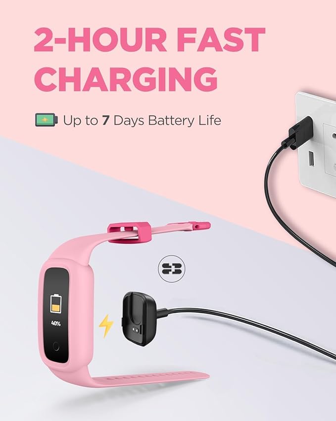 - [COMFORTABLE BAND & LONG BATTERY LIFE] Crafted with a soft, lightweight silicone band, this kids pedometer is designed for all-day comfort. Enjoy a long-lasting battery life of up to 7 days on a single charge, with just a 2-hour recharge time.