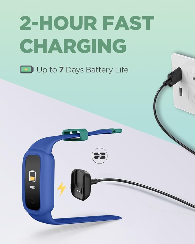 - [COMFORTABLE BAND & LONG BATTERY LIFE] Crafted with a soft, lightweight silicone band, this kids pedometer is designed for all-day comfort. Enjoy a long-lasting battery life of up to 7 days on a single charge, with just a 2-hour recharge time.