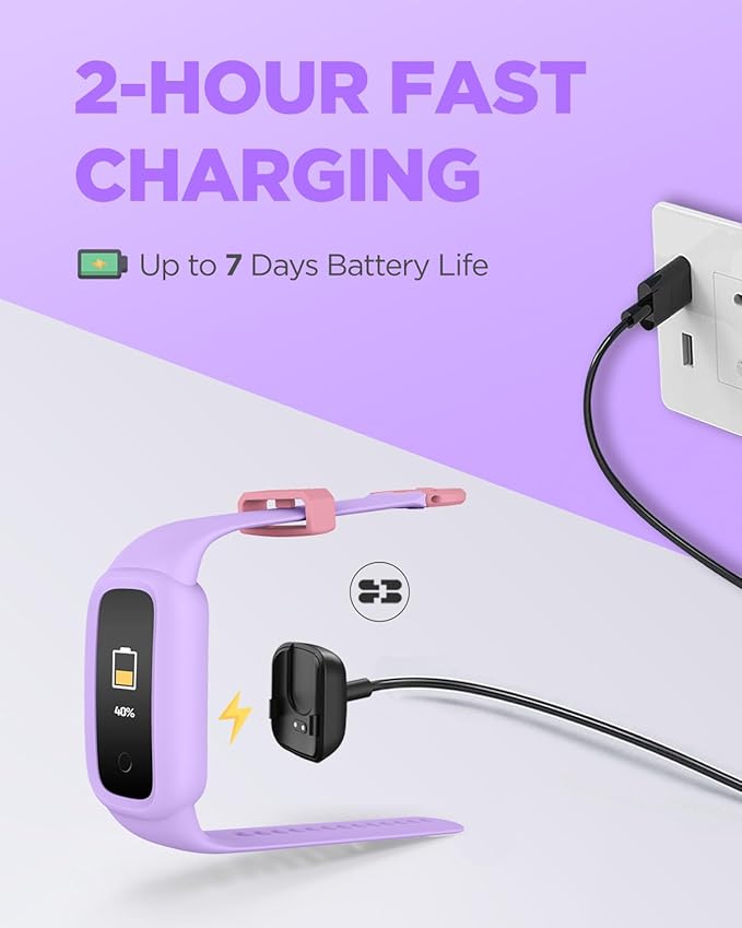 - [COMFORTABLE BAND & LONG BATTERY LIFE] Crafted with a soft, lightweight silicone band, this kids pedometer is designed for all-day comfort. Enjoy a long-lasting battery life of up to 7 days on a single charge, with just a 2-hour recharge time.