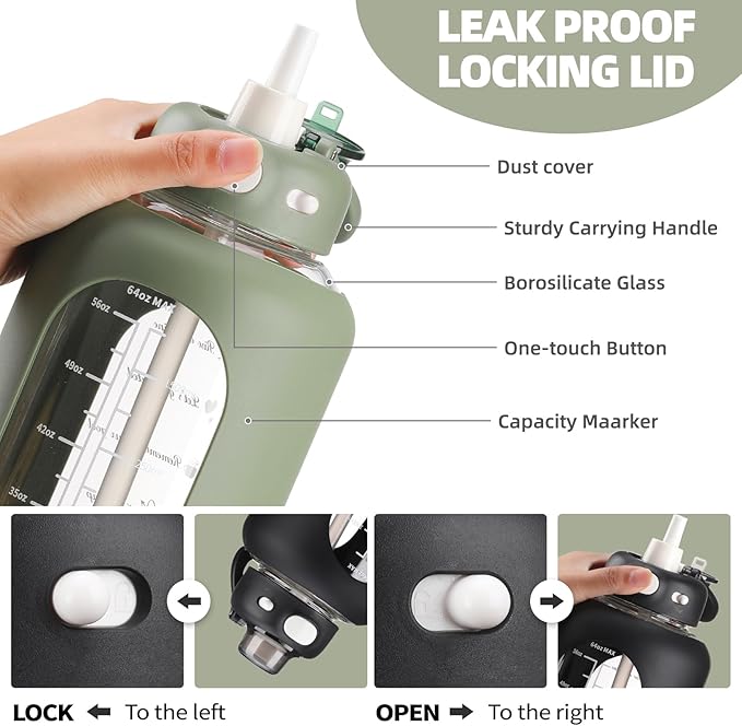 - TWO WAYS TO DRINK: This 32oz glass water bottle lid adopts food grade soft silicone spout, sealing lid adopts lock design.When drinking,just press the button lid and it will automatically pop out, when the lock button locks, the seal is 100% leak-proof, the grip is comfortable and firm, and you can easily carry wherever you go, allowing you to carry your drink comfortably for a long time