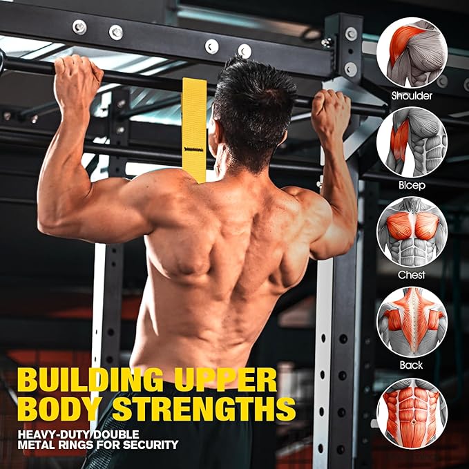 - Building Upper Body and Core Strengths:The pull-up is a Whole body exercise that exercises many muscle groups - arms, shoulders, back, chest, stomach, etc.You can also use the pull up assistance bands to improve leg strength.The assisted pull up bands are a great item for home gym. Build upper body strength quite quickly.This pull up assist band will help you reach your fitness, strength, and weight loss goals much faster, and maintain your ideal weight and strength over time