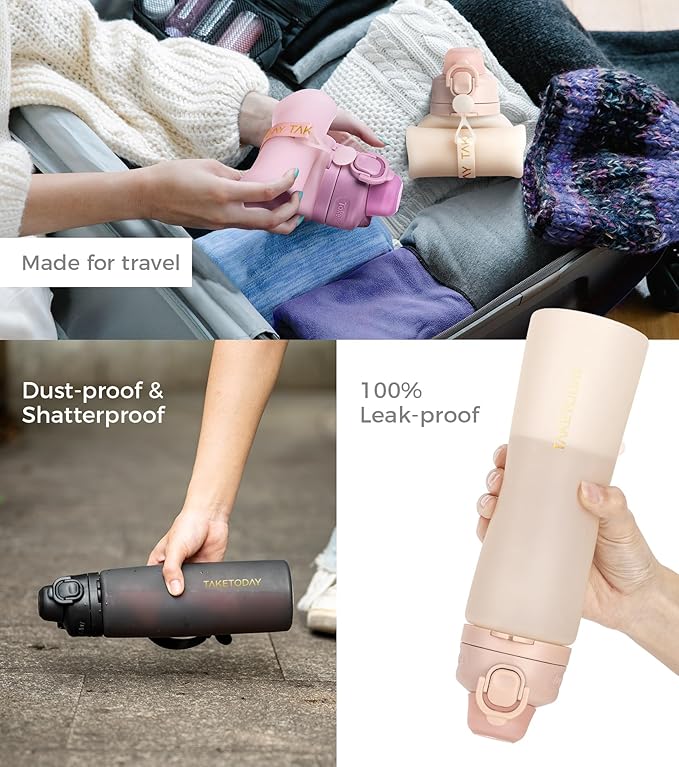 - [Sustainable Lifestyle] We care about the damage single-use plastics are doing to our environment, and we're taking action. Taketoday collapsible water bottle is reusable, sturdy, and portable, reducing the need for single-use plastic bottles. The silicone material we used is eco-friendly and our packaging uses 95% less plastic. It makes an ideal gift for those who share a healthy and sustainable lifestyle.