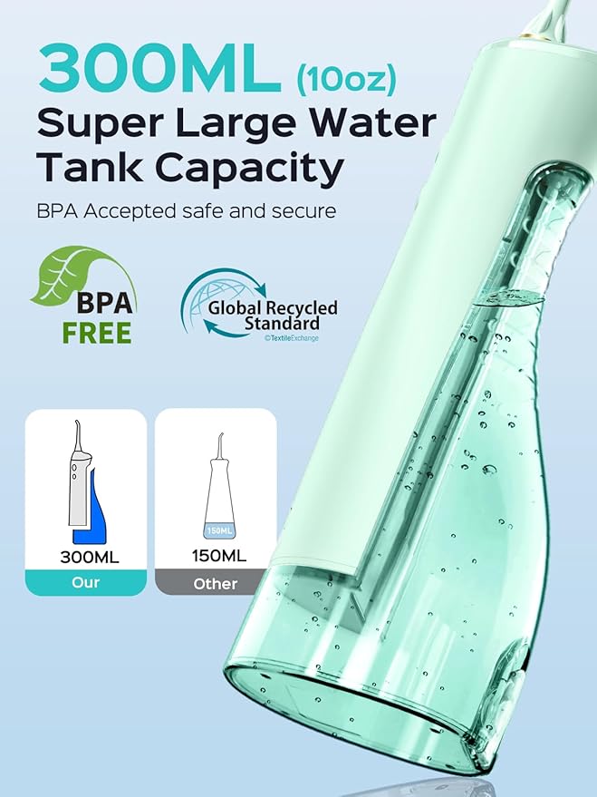 - Customizable Nozzle System: Comes with a variety of functional nozzles—including standard, orthodontic, and periodontal tips—to meet the needs of different users. Whether you wear braces, have sensitive gums, or seek deep cleaning, you’ll enjoy a targeted and comfortable oral care experience. Equipped with a 300ML large-capacity water tank, which allows for longer use without frequent refilling, making it more suitable for thorough, full-mouth cleaning and an efficient flossing experience. Supports multi-user sharing, making it especially ideal for family use and daily oral care routines