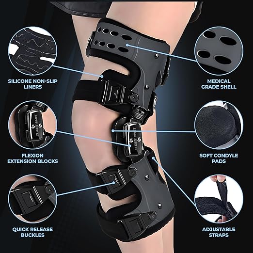 - COMPLETE CONTROL: This unloading knee brace comes with 13 adjustable dial knee extension and knee flexion sliders that limit and prevent the knee's hyperextension and flexion. This ROM knee brace ensures perfect recovery after post-op surgery bone-on-bone knee brace protection and most knee pain injuries. It provide complete control with the range of motion adjustable dial and extension and flexion sliders.