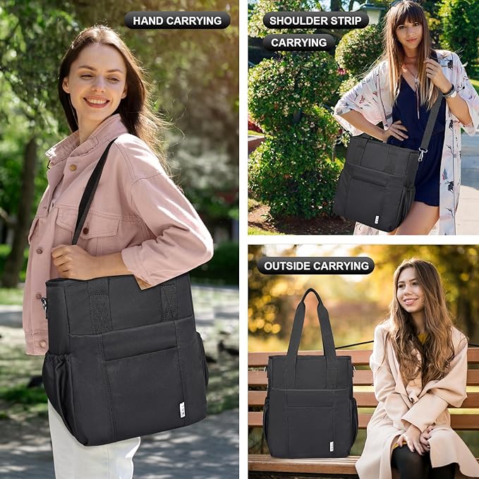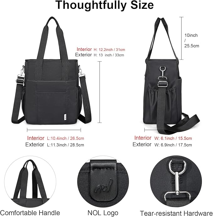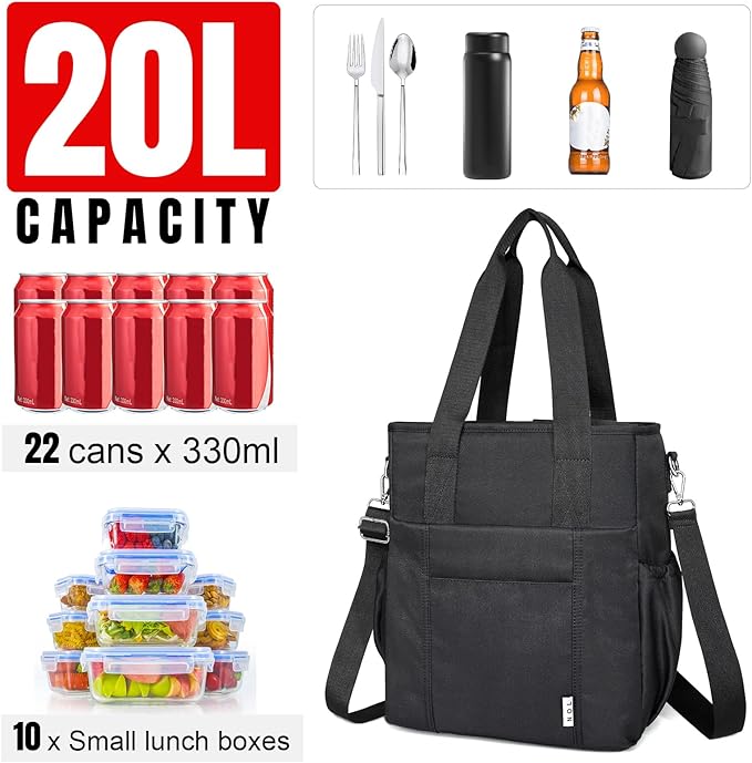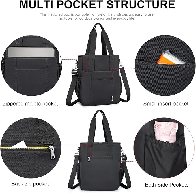 NOL Insulated Lunch Bag for Women, Large Spacious Lunch Tote Bag With Removable Adjustable Shoulder Strap with Multi Pockets,Leakproof Cooler Bag,Lightweight Nylon Waterproof Lunch Box For Work,Black