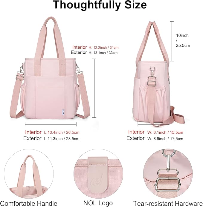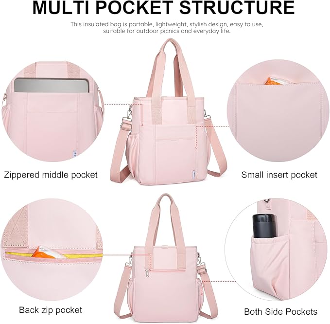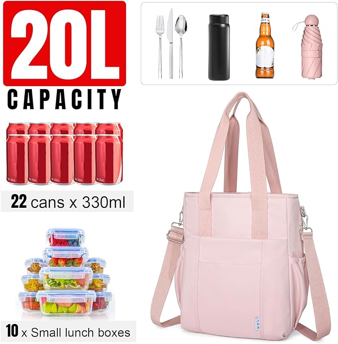 NOL Insulated Lunch Bag for Women, Large Spacious Lunch Tote Bag With Removable Adjustable Shoulder Strap with Multi Pockets,Leakproof Cooler Bag,Lightweight Nylon Waterproof Lunch Box For Work,Pink
