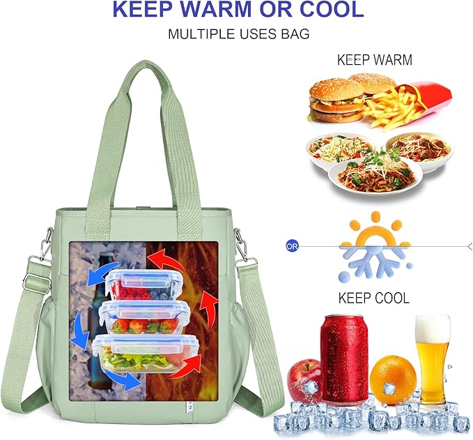 NOL Insulated Lunch Bag for Women, Large Spacious Lunch Tote Bag With Removable Adjustable Shoulder Strap with Multi Pockets,Leakproof Cooler Bag,Lightweight Nylon Waterproof Lunch Box For Work,Green