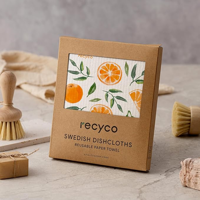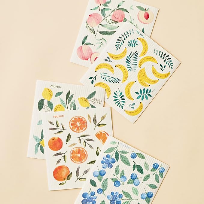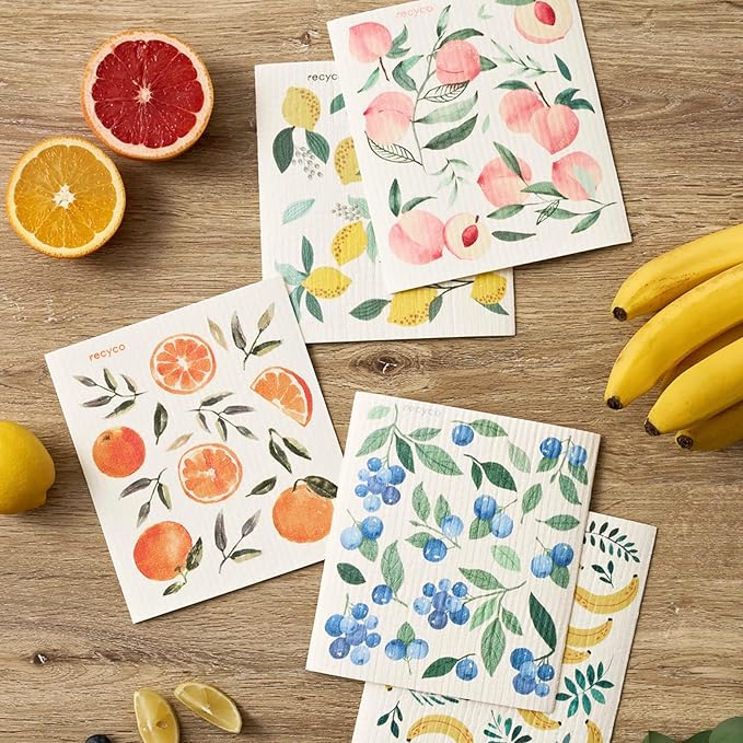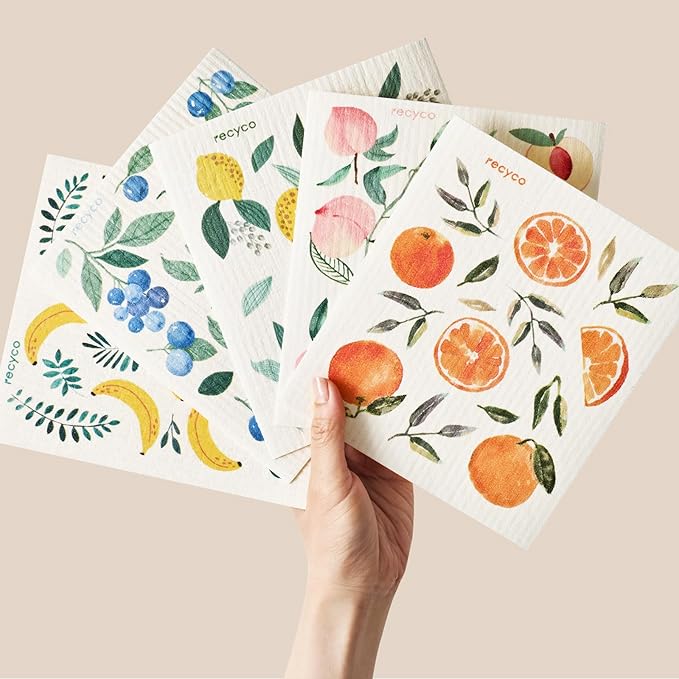 RECYCO Swedish Dishcloths for Kitchen | 5 Pack Washable Dish Rags | Cellulose Reusable Cleaning Paper Towels | Absorbent Counter Dish Cloth Sponge Kitchen Wipes, 8" L x 7" W