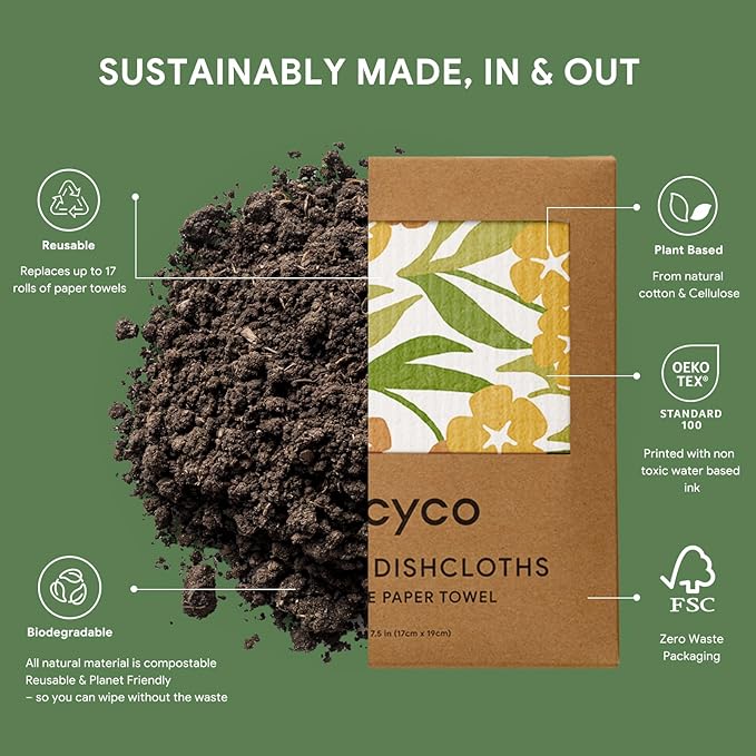 - Plant-Based & Biodegradable: Our 8” x 7” swedish dishcloth is 100% biodegradable, vegan, and free from harmful chemicals. Made from FSC certified cellulose and cotton fibers, it can decompose naturally in just 6-8 weeks, making it your best conscious choice for a greener lifestyle.