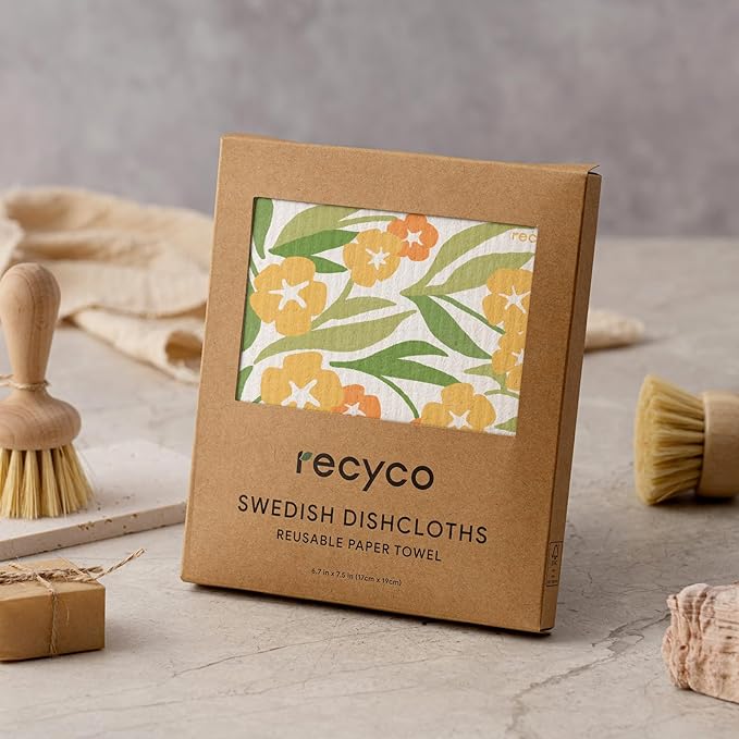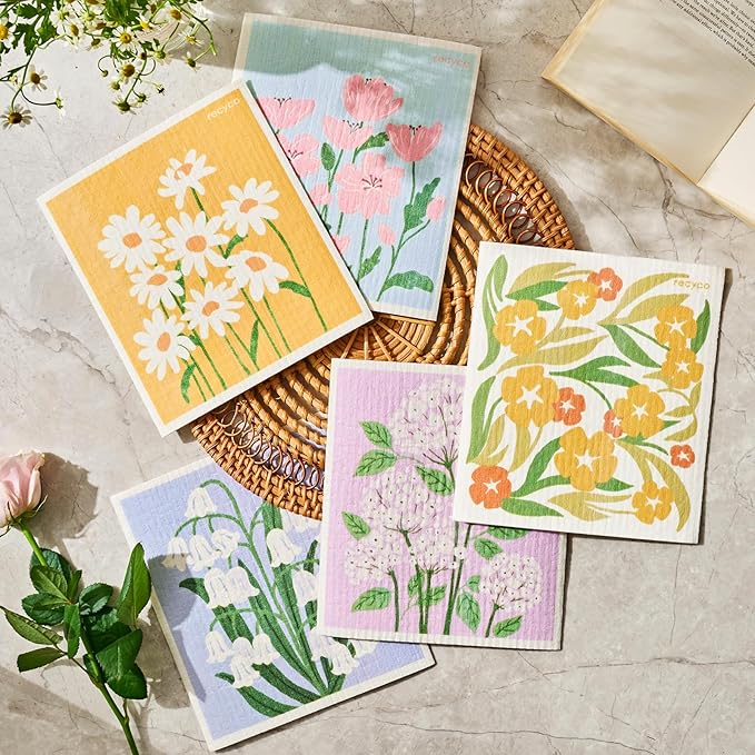RECYCO Swedish Dishcloths for Kitchen | 5 Pack Matisse Floral Washable Dish Rags | Cellulose Reusable Cleaning Paper Towels | Absorbent Counter Dish Cloth Sponge Kitchen Wipes, 8" L x 7" W