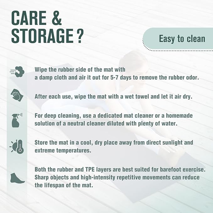 - CARE INSTRUCTION - 1. All natural rubber possesses a harmless odor of rubber. Wipe the surface of the rubber side with a damp cloth and place it in a cool, well-ventilated area for a period of 5-7 days, the odor shall gradually dissipate. 2. Clean the yoga mat by wiping the surface with a wet towel. Let it air dry naturally before storing. And store the yoga mat in a cool, dry place away from direct sunlight and extreme temperatures.