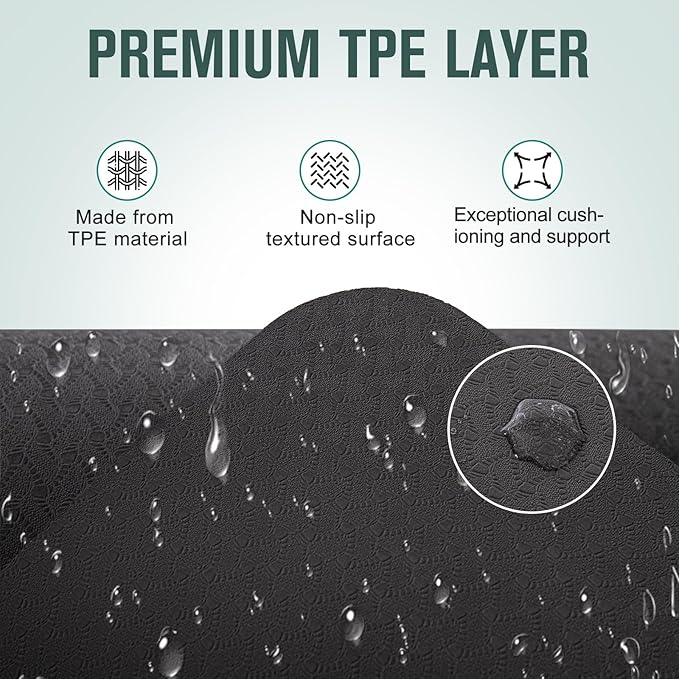 - DOUBLE NON-SLIP & ECO-FRIENDLY - Crafted with 100% natural rubber and recyclable TPE, it's PVC-free and leaves no extra burden on the planet. The rubber layer offers exceptional slip resistance, supporting your practice even during sweaty sessions. Meanwhile, the TPE bottom surface incorporates textured patterns that provide optimal traction and support.
