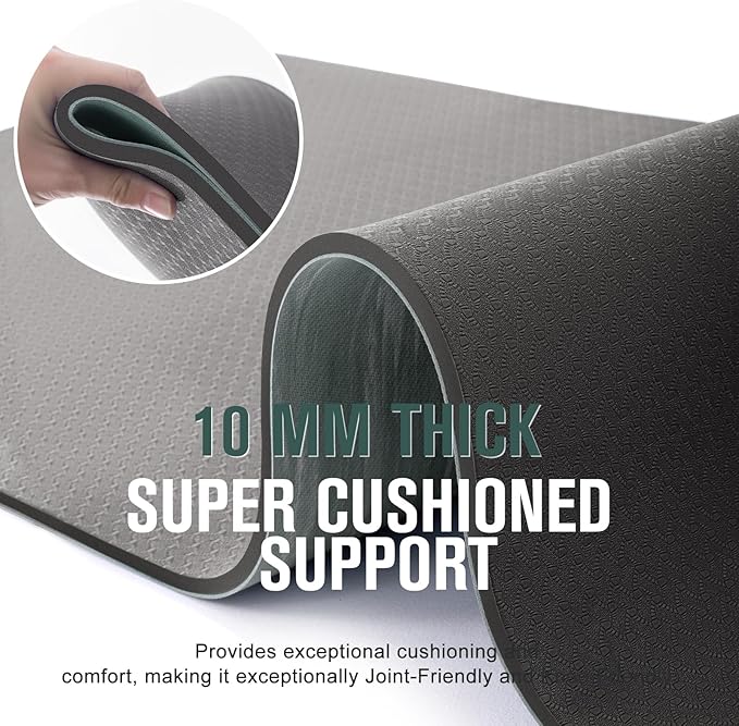- ULTIMATE CUSHIONING - 10mm thickness offers exceptional cushioning and support, effectively preventing joint and knee discomfort caused by vibrations. When compared to normal foam mats, the rubber and TPE (Thermoplastic Elastomer) materials boast higher density and quicker resilience, allowing for better balance and stability without reducing thickness.