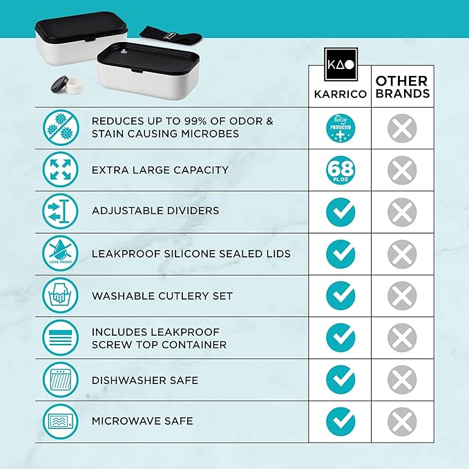 - BIOCOTE PRODUCT PROTECTION - Food leaving a lingering smell in your lunchbox is always a worry. The BPA free, leakproof and food contact safe surfaces of KARRICO bento boxes have BioCote technology that helps protect against stains and bad odors. *BioCote technology does not protect users or others against disease-causing germs, and other harmful organisms. This technology is not a substitute for good hygiene and/or cleaning practices.
