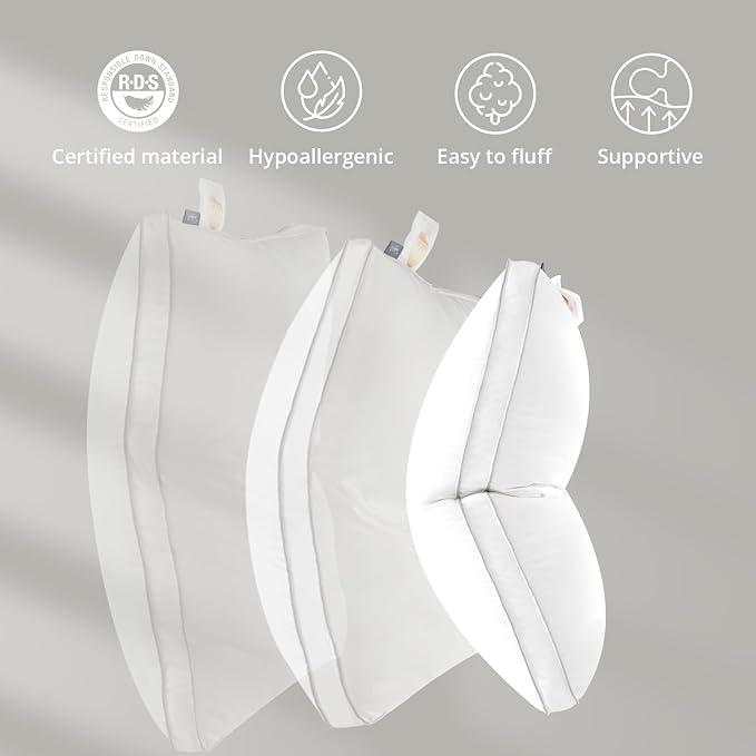 - Certified Safety and Sustainability: Our down feather pillows are authorized by Responsible Down Standard (RDS) and OEKO-Tex Standard 100, making them high clean, cruelty-free, and environmentally friendly. Rest easy knowing that your sleep is both luxurious and sustainable.