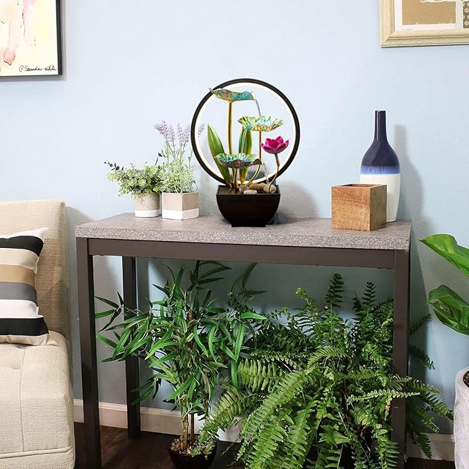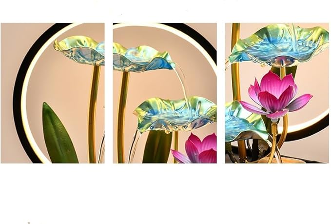 - APPEARANCE AND MATERIAL: This desktop water ornament is made of sturdy metal and plastic. The upper layer is a metal lotus leaf with 3 overlapping layers, and the lower seat is a plastic water container, which is reusable, safe and durable. It is perfect for relaxing after a hard day at work, immersing in sleep, meditation or yoga practice. Put it in your baby's room so that they can enjoy the sound of water and soft lights.