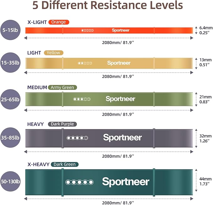 - 5 Resistance Levels: Budding beginners? Fitness professionals? No problem! Sportneer workout bands set would fit all you need, it comes with five different resistance levels with assorted colors —— pink (5-15lb), light purple (15-35lb), light blue (25-65lb), dark purple (35-86lb), and dark blue (50-130lb).
