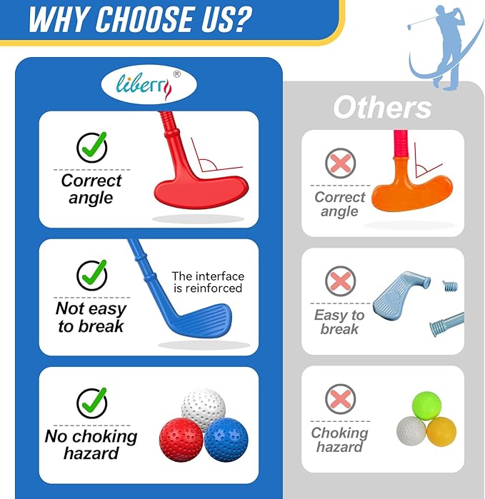 - Safe & Child-Friendly Design: Made from high-quality, safty, and odorless plastic, this toddler golf set is designed with safety in mind. Our golf balls are larger, it can effectively avoid choking hazards, making it safe for young children to handle and play with