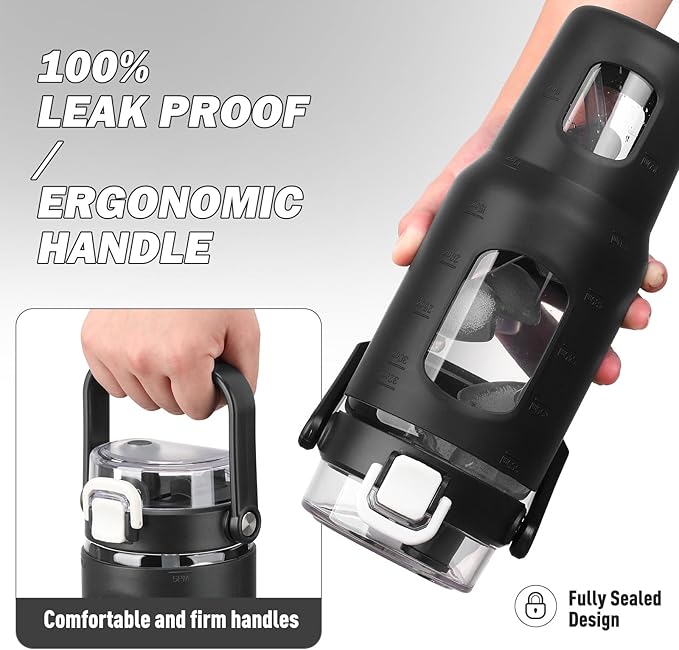 - Lockable & Leakproof Flip Lid: The handy, lockable flip lid prevents leaks and can be opened with one hand for those times when you’re on the move and your arms are full. Our leak-proof glass water bottle with straw makes your drinking dribble-free. The straw spout gives you a comfortable and quick drinking experience and this glass water bottles with time marker comes with 2 straws and 1 brush and the carrying handle on top makes it easy to tote around town.