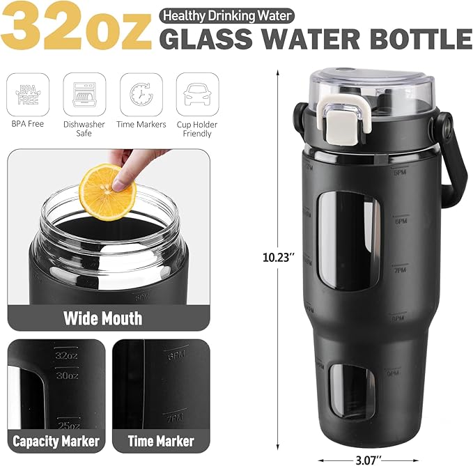 BLUEGO 32oz Glass Water Bottles with Straw Time Marker Half Gallon Large Motivational Water Bottle with Silicone Sleeve 2 Liter Large Glass Water Jug for Gym, Sports& Workout, Daily, Black